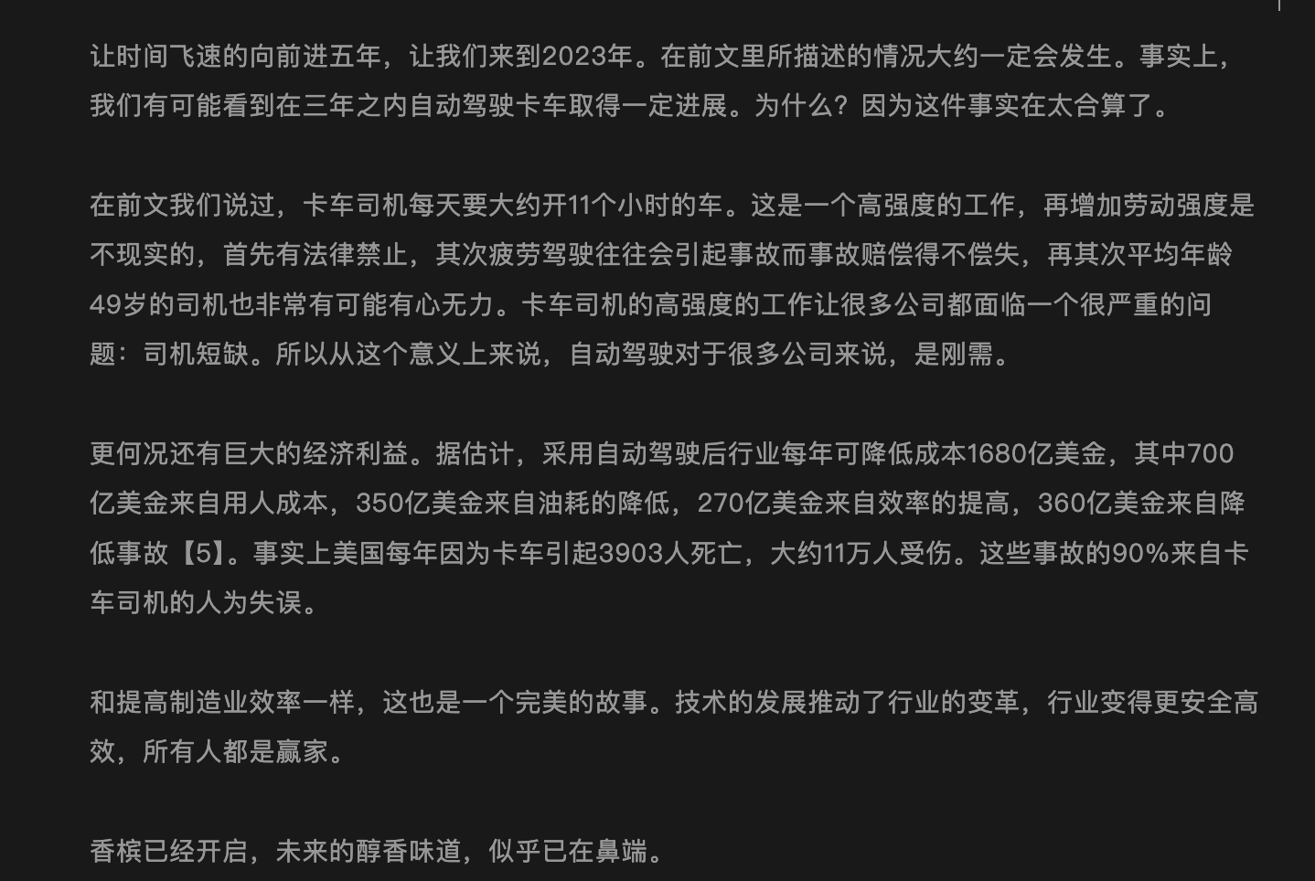 The cascade effect — $21 trillion at risk: Truck drivers spend approximately $6,000/year eating and lodging on the road (at $25/day × 240 nights). 3.5 million drivers × $6,000 = $21 billion/year in direct service industry spending. Eliminating or halving this spending cascades to fast food, rest stops, vending, motels, and the broader service economies of truck-dependent towns. The $168B/year industry saving comes at the cost of disrupting a much larger service economy. Some towns built entirely around trucking services face potential abandonment within the author's projected timeline.